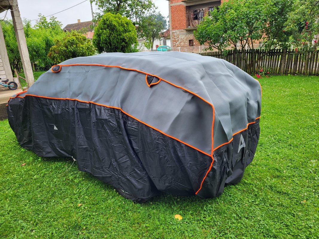 Protivgradni prekrivac za auto koji sam prosle godine koristio na Hyundai Tucson-u, isproban na sitnom gradu. Kupljen u Gumatic-u nekih 15000 ima vise velicina i od toga zavisi cena.