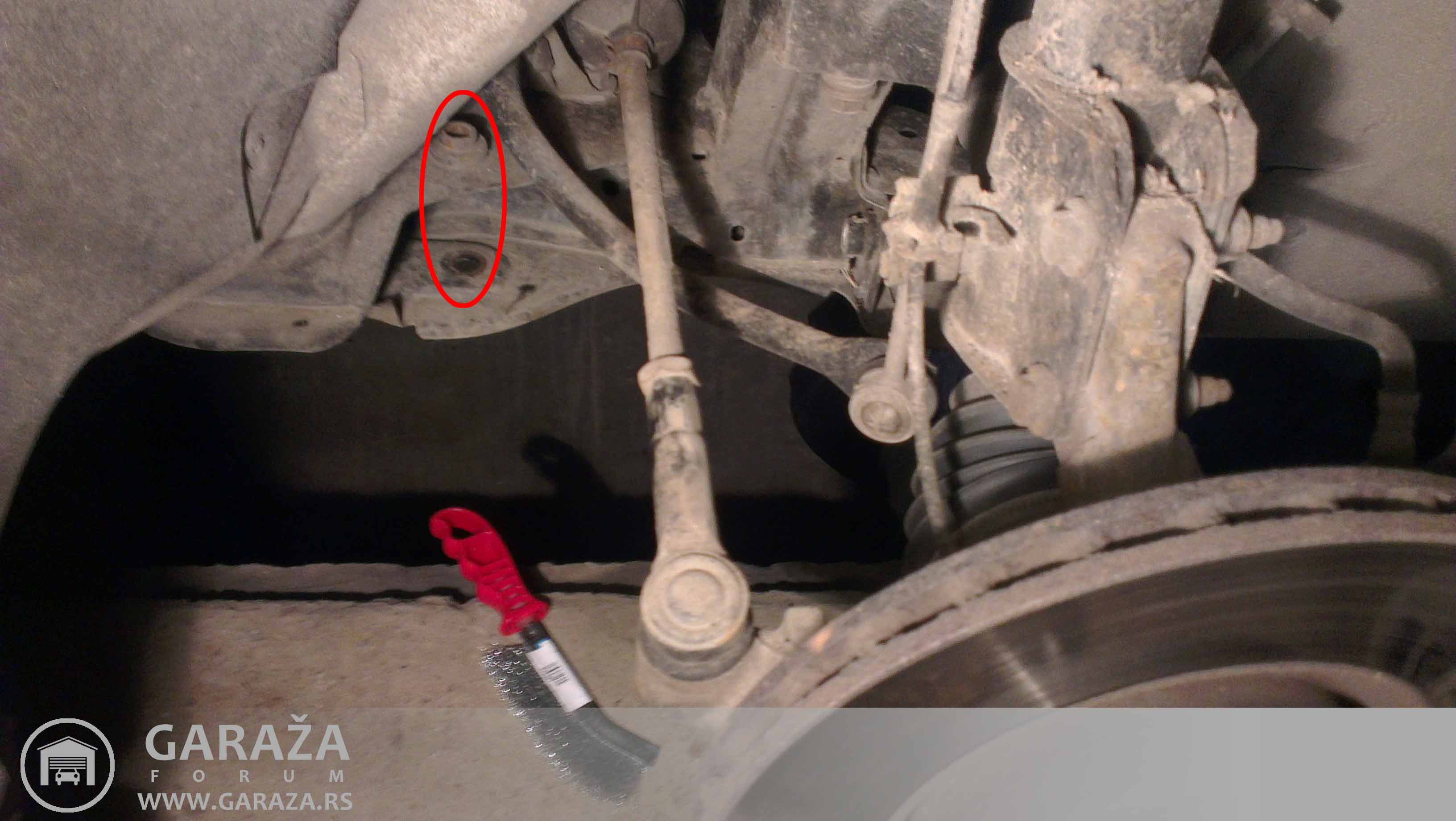 3. Slikano sa strane, leziste blize zadnjem delu vozila gde sraf prolazi vertikalno kroz silent blok, zaokruzeno.