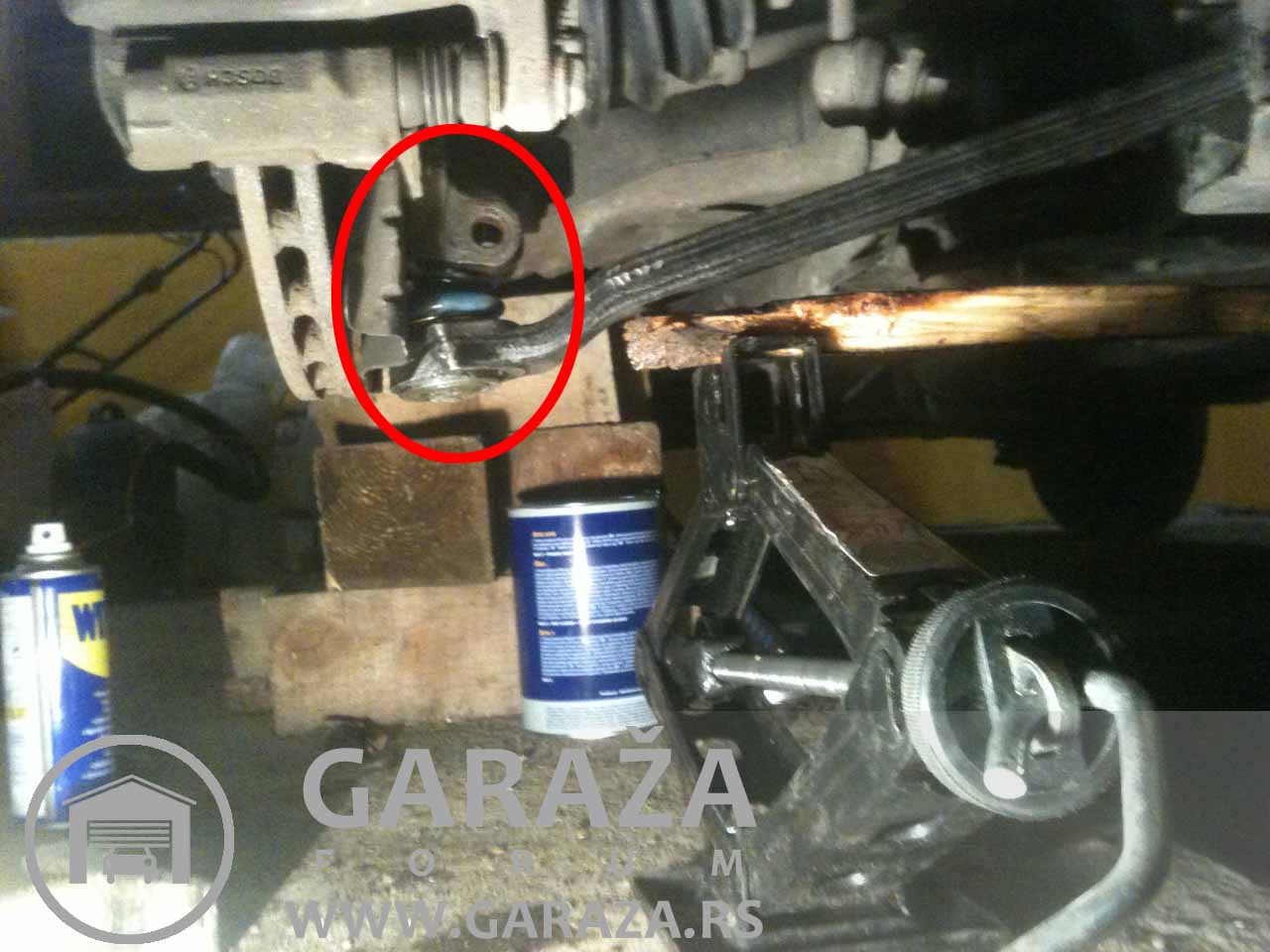 3. Slikano sa strane, leziste blize zadnjem delu vozila gde sraf prolazi vertikalno kroz silent blok, zaokruzeno.