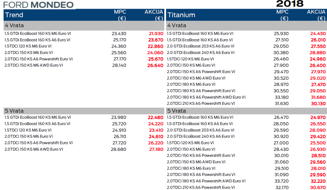 Mondea nema više u prodaji, čeka se novi model. Tražio sam cenovnik za ovaj stari pa ako mi pošalju iz Forda postaviću čisto poređenja radi.