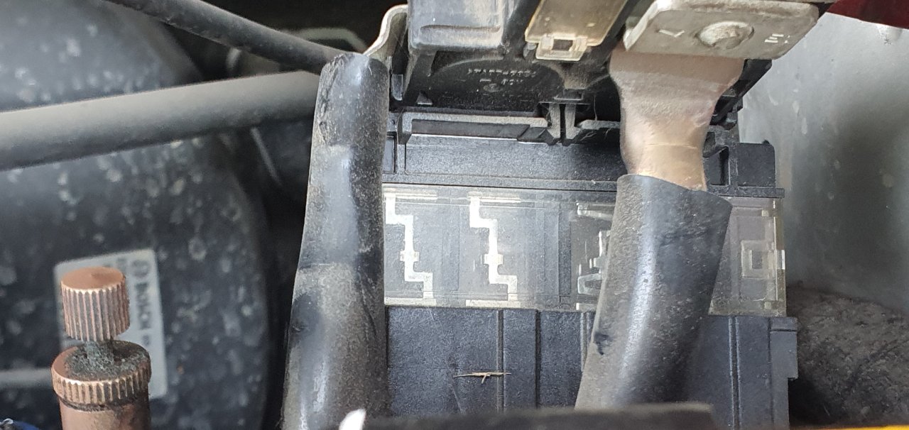 Situacija je sledeća. Moraće da se skine ceo ovaj set sa osiguračima na ove dve matice. Verovatno se na to mislilo? Jer nekih malih srafova nema. Sam osigurač ne može da se promeni, mora sve, sve je zatopljeno u jedan deo. Skinuo sam plastiku sa britvicom i licnovao osigurač uz pomoć prijatelja. Sad je 60A umesto 80A, da budem siguran ako je proračun omasio. Auto radi.