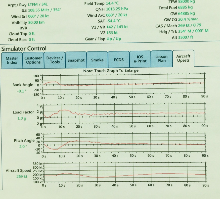 Uvodjenje u stall. Pitch preko +45 stepeni, opterecenje preko 2G. Brzina je pala ispod 150kts, avion je izgubio uzgon ali sam ga uz smanjenje pitcha i postepeni prirast brzine izvadio iz stall-a.