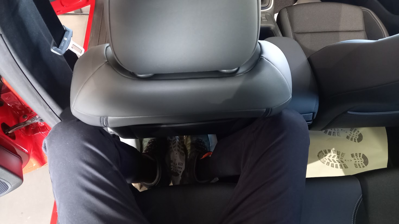 Kada sednem pozadi „iza sebe“, evo kako izgledaju moja kolena u mom Jazz-u (slične dužine, a oko 3 cm manjeg medjuosovinskog rastojanja ), a kako u Avengeru. U Jazz-u mnogo više mesta za kolena (za glave je pozadi više mesta u Avengeru).