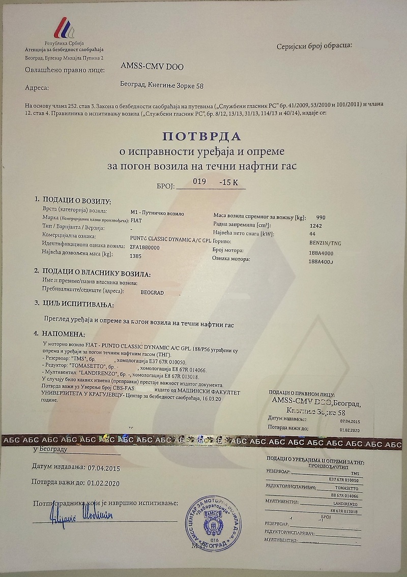 Koliko vidim iz tog dokumenta, od stare instalacije ostala joj je samo boca sa multiventilom. Isparivač je zamenjen drugim (stavljen Tomaseto), a sigurno je promenjen i gasni ECU i dizne. Malo me čudi težina auta jer je meni upisano 910 kg, a njoj piše 990 (odakle sad razlika od 80 kg!?), a oba auta su kao isti model. No, čim je sve to prošlo bez problema - umesto da potvrde ili opovrgnu ispravnost svega na osnovu starog atesta, tj. da ustanove promene i zahtevaju novi atest, oni su u potvrdu (a iz koje je očigledno da je ovo zaista kontrolni pregled iliti po naški "reatest") - jednostavno upisali potpuno novo stanje koje se uopšte ne slaže sa potvrdom o atestu, bez postavljanja dodatnih pitanja. Neozbiljnost i očigledna svrha svega ovoga je jednostavno - uzimanje para.