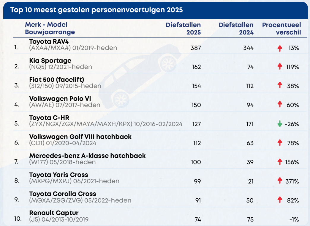 Хибриди су раније били у вијестима због њихове релативно високе сензибилитете за крађу, али су тада били углавном плуг-ини. Сада су хибриди Тоиота, а нарочито РАВ4, Ц-ХР и Аурис, популарни. РАВ4 је сада чак и аутомобил са највећим ризиком од крађе, иако је у апсолутним бројевима углавном немачки модели који су често украдени. Волксваген, БМВ и Ауди заједно чине врх 3. Између осталог, Волксвагенс Поло и Голф, БМВ 3-и 5-серија и Мерцедес-Бенз Е-класа завршавају високо на листи модела. Запањујуће је то што се Фиат 500 може рачунати на ову групу.