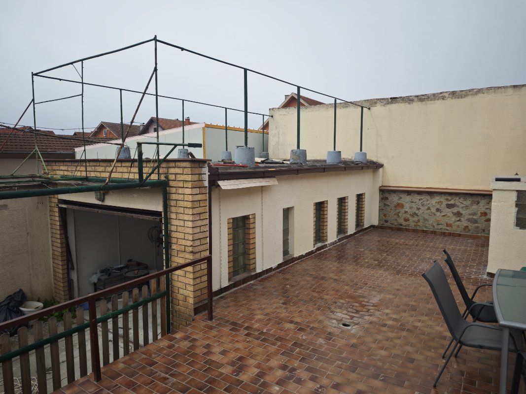 Pored same kuce se nalazi plato (na koji se izlazi iz dnevne sobe) a na plato se nadovezuje garaza. Garaza nema standardni krov, uradjen je blagi nagib i bitimenski premaz a iznad je dugo bila vinova loza a sad su ostali samo nosaci za tu vinovu lozu koji ce se skinuti (cevi i betonski delovi).