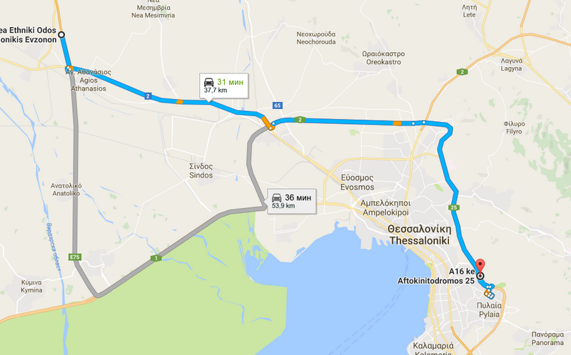 Voziš samo pravo (iz pravca Evzonija) i nailaziš na taj nadvožnjak, ideš preko njega i uključuješ se u levu traku autoputa. Dakle, ignorišeš sve pokušaje navigacije da te isključi desno i pičiš pravo do nadvožnjaka. U povratku opet ignorišeš prvi pokušaj da te opet isključi desno za Evzoni i voziš dalje dok ne dođeš opet ring roada. Ako slušaš navigaciju ideš garantovano kroz industrijsku zonu (što je po meni i najbolja opcija).