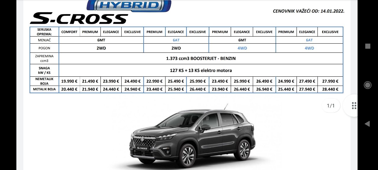 U Mađarskoj, GLX/Elegance košta 22600 bez popusta, 19800 sa popustom. Sa sličnim popustom, kod nas bi bio oko 21-22k, što je OK na sadašnjem tržištu (iako je 20 još bolje). Poslednji popust na SCross je bio 1100€ (kod nas), što bi došlo na 23k.