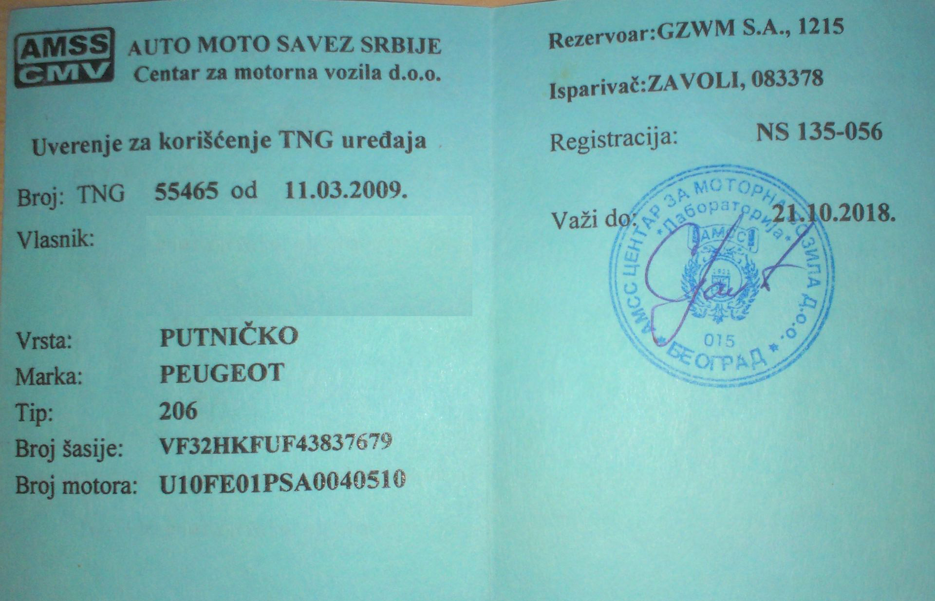 Danas sam registrovao 206-icu i malo se raspitao o toj papazjaniji. Pošto je autogas ugrađen marta 2009. godine, marta 2014. godine mi ističe atest, iako sam ga prvobitno dobio na 10 godina. E, sad, nije to sve. Ako ostane kako jeste sada, moraću da menjam i bocu. Kod mene je cilindrična i (šatro) vek trajanja takvih boca se poklapa sa trajanjem atesta. Stvarno nemam reči.