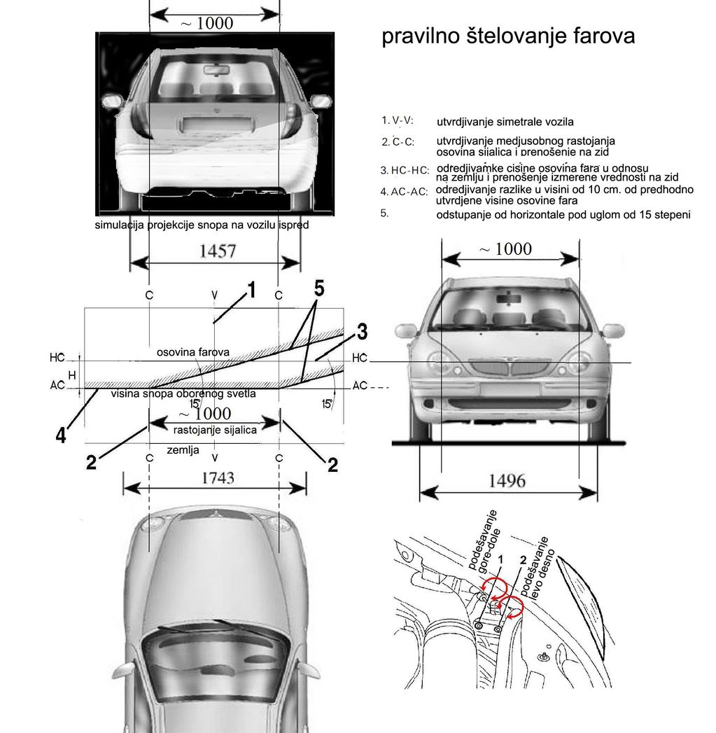 U kabini podesi na nulu, nista od teskog nemoj imati u gepeku. Na tehnickom se najbolje "upucaju" farovi, tu nema spora. Ovo "od oka" sa zidom i racunaljkom moze biti dobro, ali ne i precizno kao sa masinom ["kutuja" sa osama, gde se lepo vidi trag svetla].